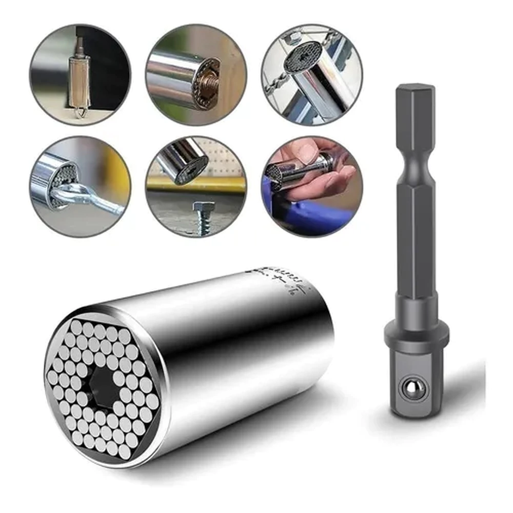 A Chave Universal é a solução prática e versátil para remoção de parafusos, porcas e ganchos de diversos formatos, inclusive danificados, enferrujados ou com cabeças gastas. Adaptável a qualquer tipo de fixador entre 7mm e 19mm (ou 1/4" a 3/4"), substitui diversos soquetes em uma única ferramenta.