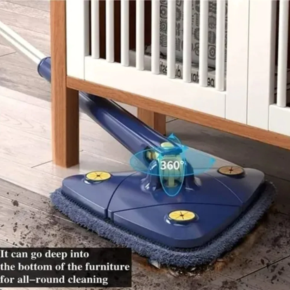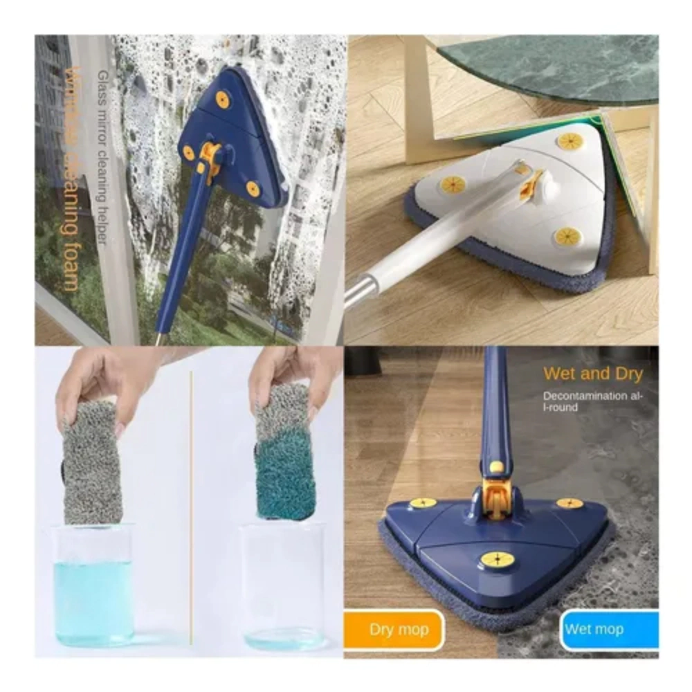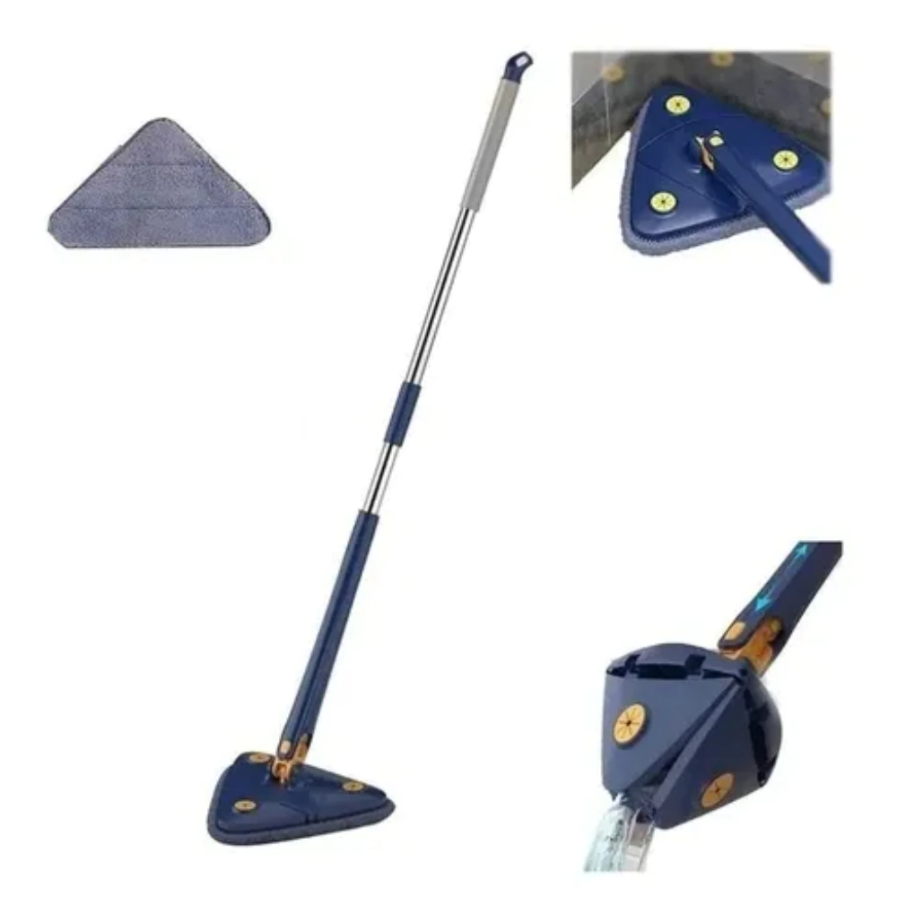 A cabeça giratória do esfregão permite a fácil limpeza de superfícies de difícil acesso.