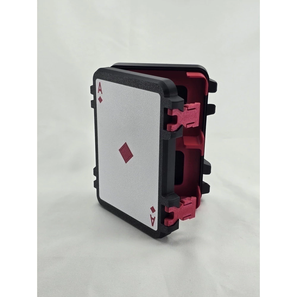 Seu formato inspirado em uma carta de baralho garante um visual único e elegante. Possui travas seguras e compartimentos internos ajustados, permitindo armazenar dois baralhos padrão com segurança, evitando danos e perdas.