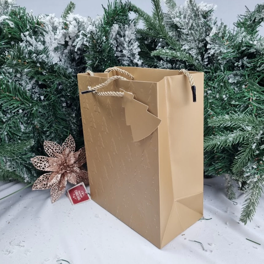 Embalagem para presentes com alça.Decorada com elevação de árvores de Natal. medidas: 26x32cm composição: celulose.